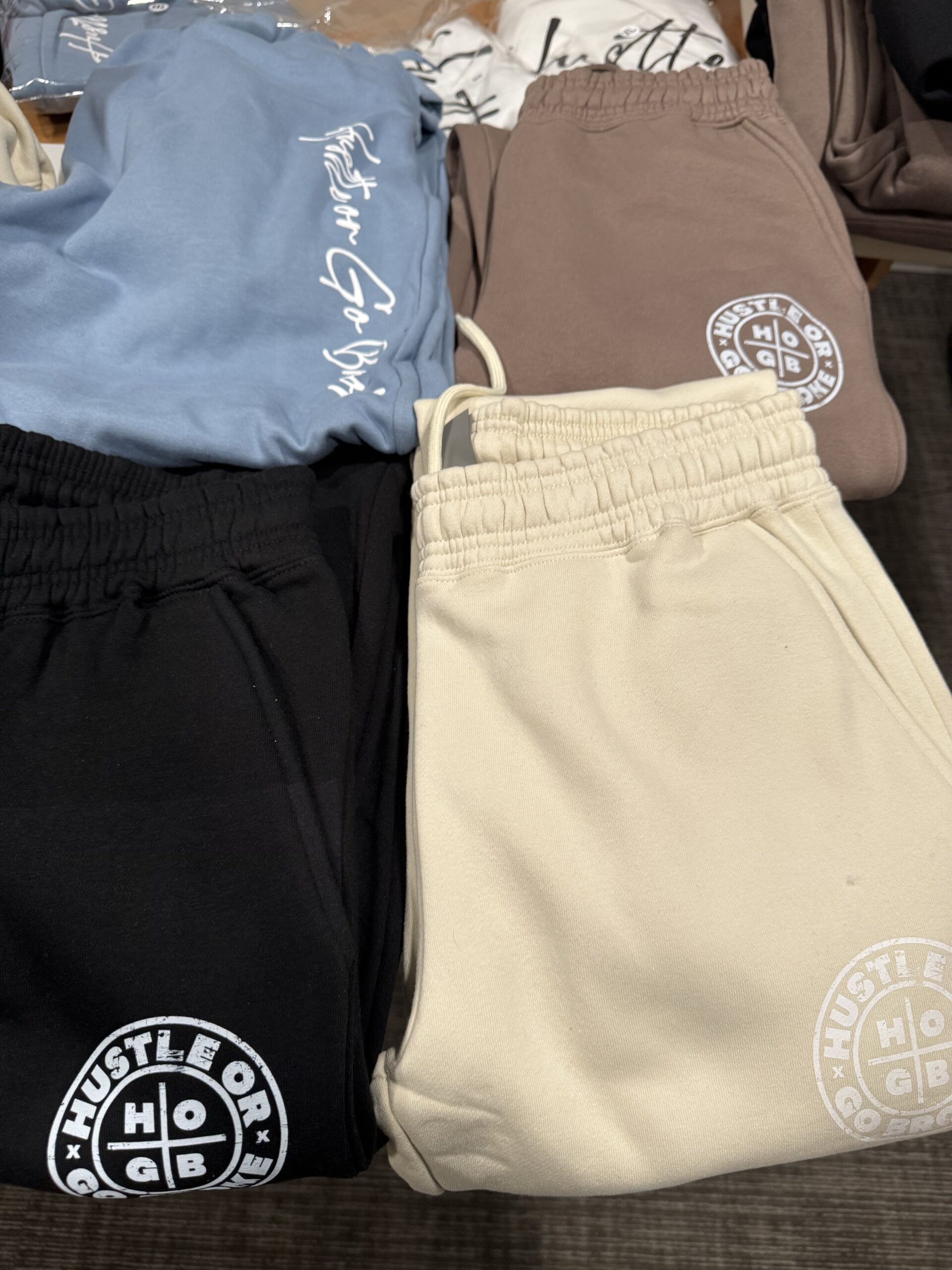 Premium quality Hustle or Go Broke sweat pants. Available in Black, Tan, Brown, and Blue.